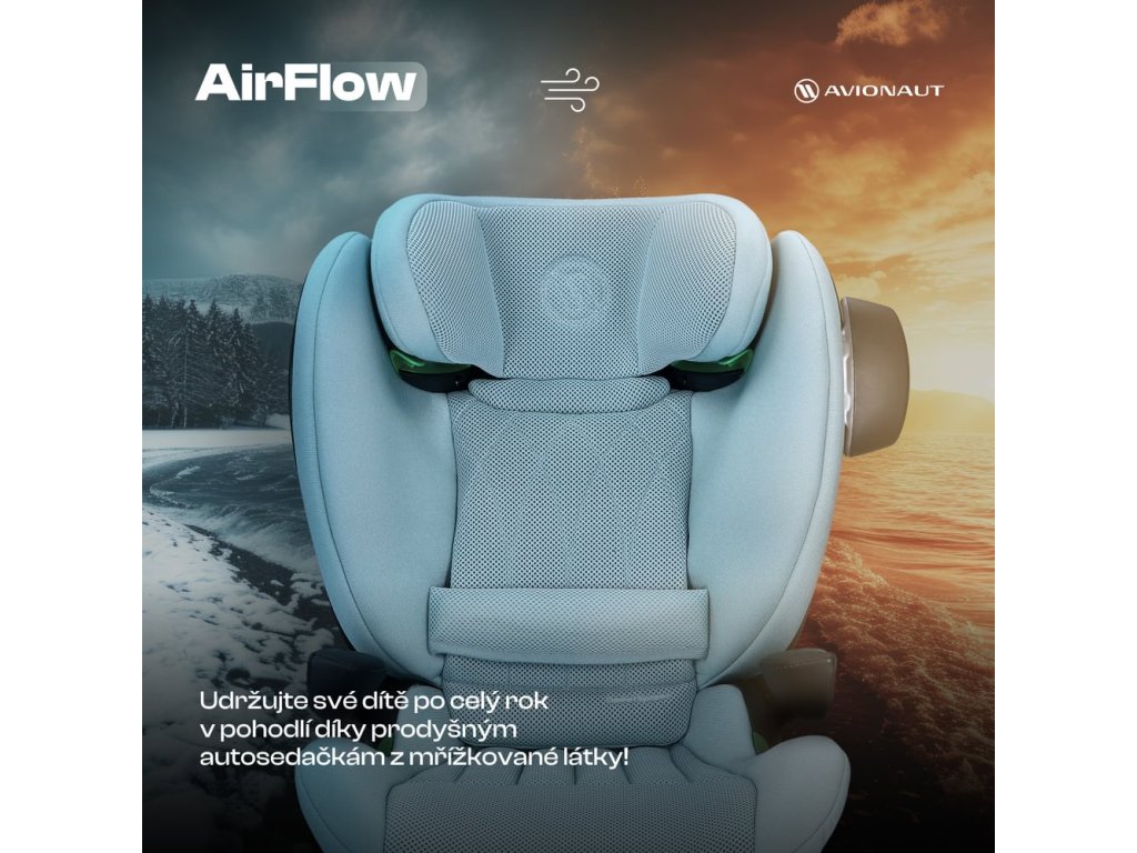 Avionaut MaxSpace AirFlow je sedačka vytvořená ze síťoviny, která zajišťuje vynikající regulaci teploty. Díky prodyšné struktuře síťoviny se autosedačka přizpůsobuje povětrnostním podmínkám – v horkých dnech udržuje dítě v chladu a zabraňuje pocení a v zimě působí jako izolační vrstva, která udržuje teplo a zároveň odvádí vlhkost. Díky tomu je MaxSpace AirFlow spolehlivý a pohodlný po celý rok a není třeba používat další vložky a potahy. Pro Avionaut MaxSpace AirFlow nejsou každodenní výzvy spojené s cestováním žádným problémem. Čalounění z odolné síťoviny nejenže zajišťuje dlouhotrvající prodyšnost a měkkost, ale také si zachovává svůj tvar a strukturu i přes intenzivní používání a opakované praní. Udržování sedačky ve výborném stavu je jednoduché a její odolnost zaručuje, že vydrží dlouho.