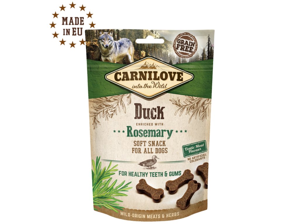 Carnilove Semi Moist Snack s obsahem kachního masa a netradičním tvarem jsou lákavou odměnou pro každého psa. Jejich poloměkká textura napomáhá lepší stravitelnosti, a proto jsou vhodné i pro psy menších plemen. Jedná se o doplňkové krmivo. Pamlsky jsou obohaceny o bylinky a lesní plody, které jsou bohatým zdrojem přírodních antioxidantů.