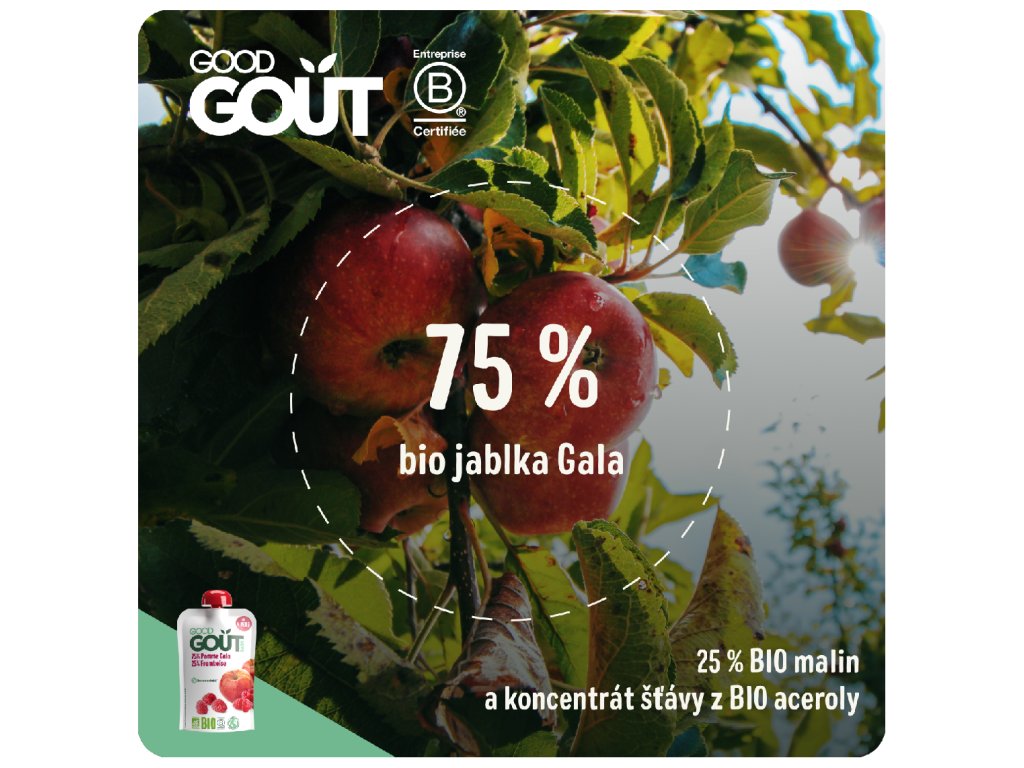 Složení: 75 % bio jablka Gala, 25 % bio malin, koncentrát šťávy z bio aceroly. Nic víc.