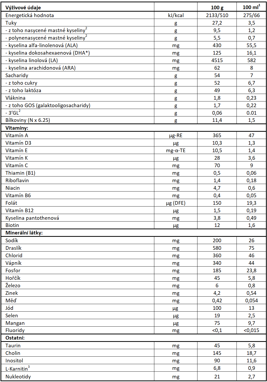 Složení: BIO plnotučné MLÉKO (103,5 g tekutého mléka na 100 g prášku), BIO odstředěné MLÉKO, BIO demineralizovaná bílkovina MLÉČNÉ syrovátky, BIO rostlinné oleje (slunečnicový, kokosový, řepkový), BIO galaktooligosacharidy (z MLÉKA) 2,6 %, citrát vápenatý, citronan sodný, chlorid draselný, mléčnan vápenatý, chlorid hořečnatý, olej z mikrořas Schizochytrium sp., vitamín C, hydroxid draselný, cholin bitartát, inositol, olej z Mortierella alpina, taurin, nukleotidy (cytidin-5‘-monofosfát, sodná sůl uridin-5‘-monofosfátu, adenosin-5‘-monofosfát, sodná sůl inosin-5-monofosfátu, sodná sůl guanosin-5‘-monofosfátu), síran železnatý, síran zinečnatý, vitamín E, niacin, kyselina pantothenová, síran měďnatý, thiamin, riboflavin, vitamín A, vitamín B6, síran manganatý, kyselina listová, jodid draselný, seleničitan sodný, vitamín K, vitamín D3, biotin, vitamín B12. Alergeny jsou vyznačeny VELKÝMI PÍSMENY. Složení se vztahuje k sušenému stavu potraviny.