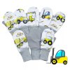 Na fotografii je vyfocena jedna rukavice z přední a druhá ze zadní strany. Spodní strana je šedá, vrchní strana dětské softshellové palcové rukavice je s potiskem různých strojů.